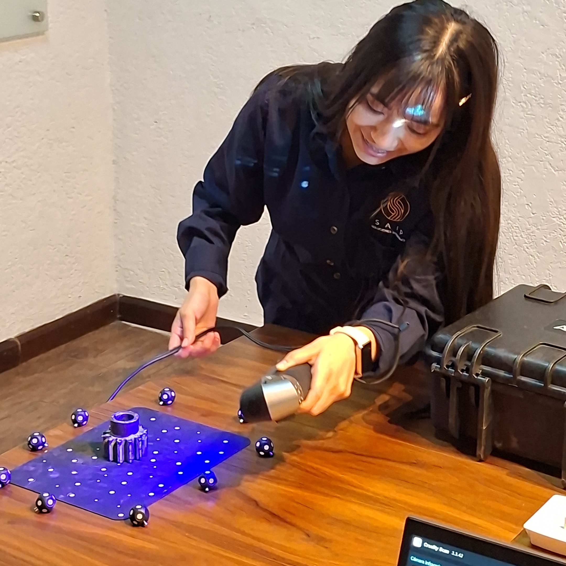 Nuestro escáner, además de la tecnología de laser azul, incorpora tecnología de rayos infrarrojos estructurados, con lo cual se puede lograr escaneos sin marcadores y puede escanear caras, cuerpos humanos y otros objetos de forma precisa y a color.